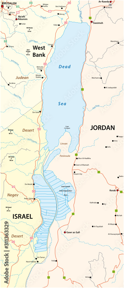 Map of the Dead Sea, lying between Israel West Bank and Jordan